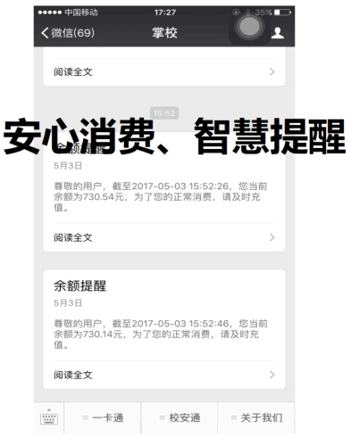 家长:为家长提供了解孩子在校就餐情况的途径,家长可以通过手机端实时收到孩子在校的消费提醒、余额不足提醒、在线充值和获取孩子的就餐情况,为后续的沟通提供数据支撑。